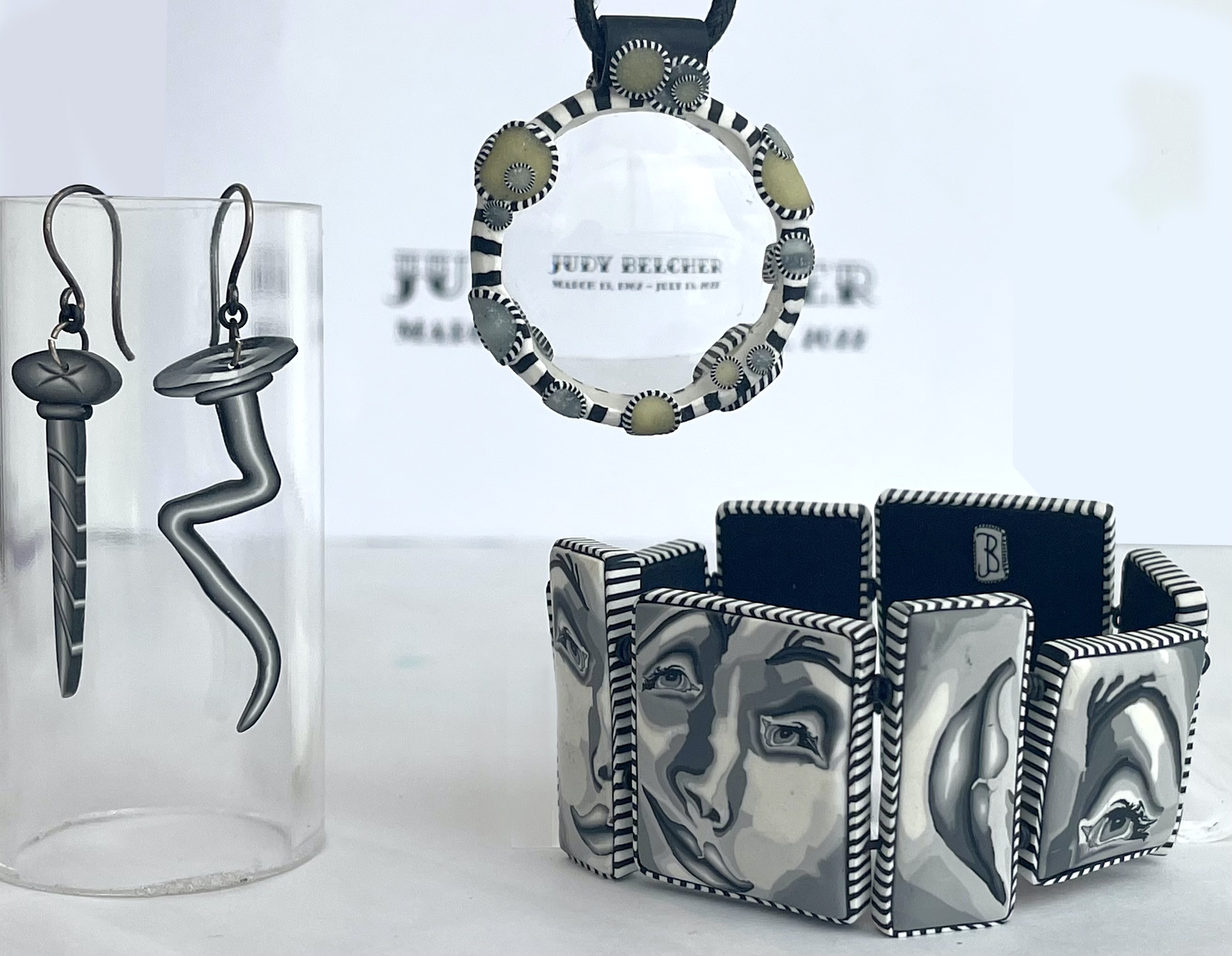 It’s nice to see some of her polymer work in the Retrospective Collection. My favorite —-a piece she called a ‘butt reducer’. She made her pendant around a magnifying glass that she insisted had to be used backwards so things appeared smaller. I thought it was brilliant! I think she ‘nailed it’!