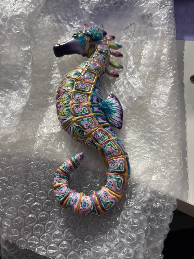 Occasionally we get a fun surprise. We met Helen Cruickshank, the evening speaker at the Ky/Tenn Guild Dam Retreat, who taught everyone how to make a seahorse and properly use British slang. She offered to send us a seahorse for the collection, which we leaped at! You can imagine the surprise and delight when I opened the box!