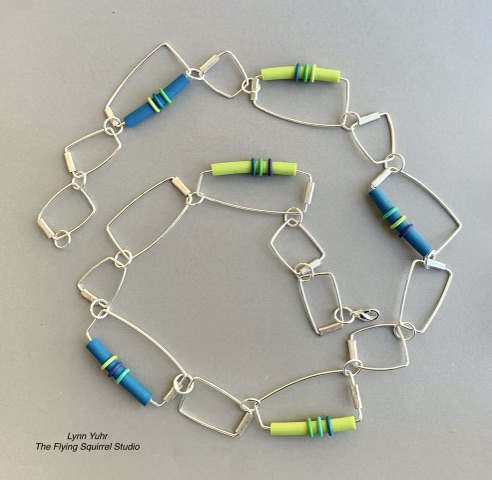 This class focuses on making chains using simple links and some creative cold connections. I will cover some of the basics when working with wire (work hardening, straightening, and whether to add a patina and when). My approach is to use simple elements that can be varied to adapt between necklaces, earring, bracelets and even brooches. Then the fun begins exploring shapes, scale, and the rhythm of patterns in both the wire and polymer clay. The polymer techniques we will be playing with are stripes (flat veneers, canes and extruded). They are fun, fast and bold – using bright colors to make each piece sing!